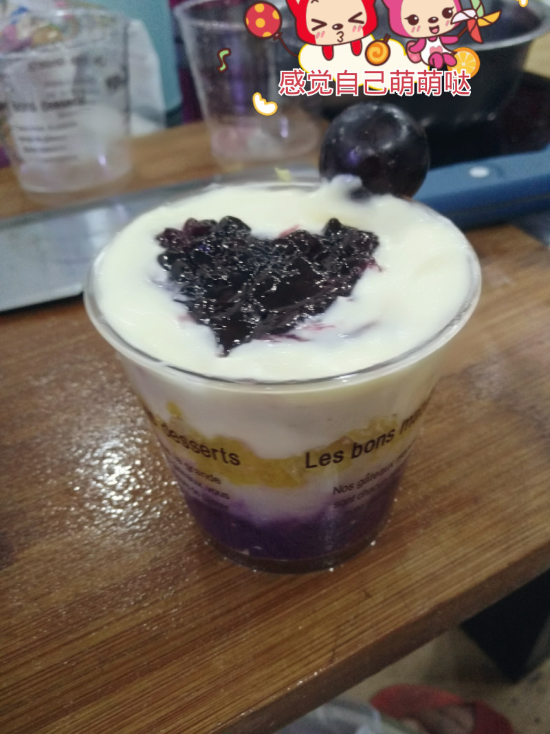 5:最后就是装杯了,首先装入一层紫薯,第二层当山药,第三层菠萝丁,第四层再放山药,第五层铺淡奶油,用蓝莓酱铺成心形,把葡萄切一小口夹杯沿上就完成啦。