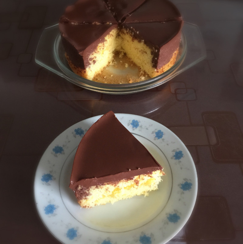 6:这时的巧克力是温的,倒入到冷却的蛋糕里