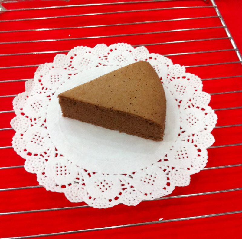 6:将烤好的蛋糕倒置,放凉,切成三片(还有半个蛋糕是因为面糊多了)。