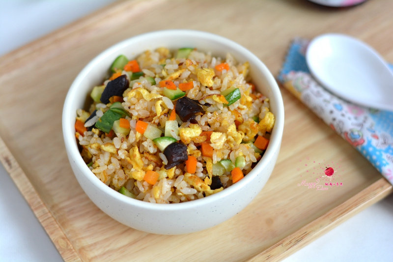 米饭入锅前能用筷子打散最好,这样受热均匀,剩米饭一定要加热充分再吃,否则冰箱里的细菌会因加热不够而导致肠胃炎;油不要太热时倒入鸡蛋液,用筷子快速打散,这样的鸡蛋块细小而均匀;胡萝卜丁不易熟,所以要先下锅中翻炒到半熟;香菇酱的多少随个人的口味来增加,因为香菇酱是咸的,所以盐要酌量加入。