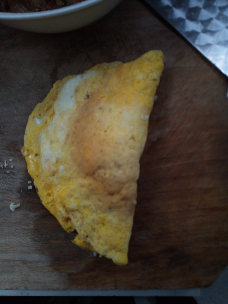 4:煎一面熟翻身放入准备好的饭,对折煎熟就可以出锅了