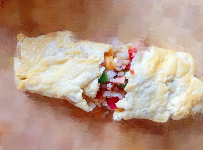 7:最后用煎好的鸡蛋把饭包起来就可以咯~(可以在蛋上放点酱,蛋可以不切开~)