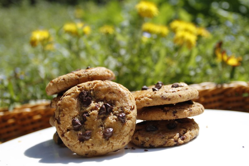 7:没有模具,只能用手按扁,在每一个饼干上放6到10个巧克力豆。放入预热的烤箱,180度烤15分钟即可