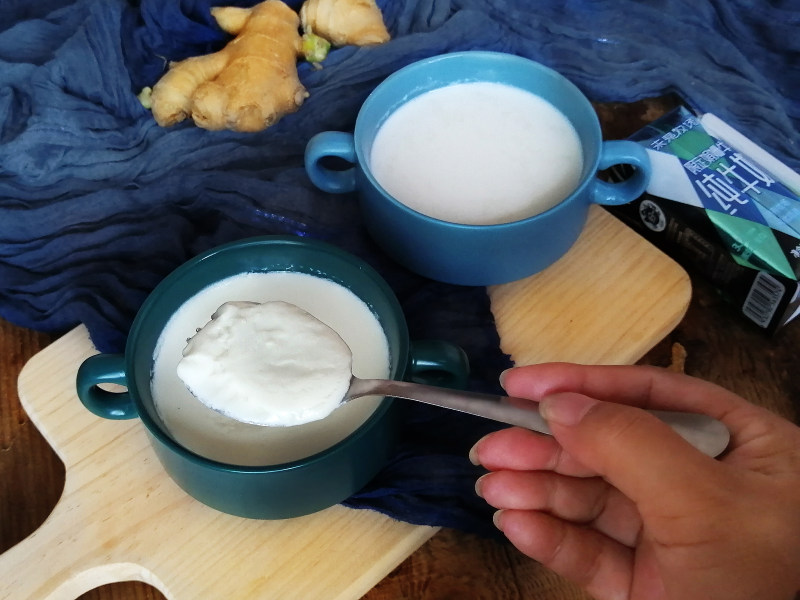 7:牛奶冲进装有姜汁的容器里静置半小时让它凝结