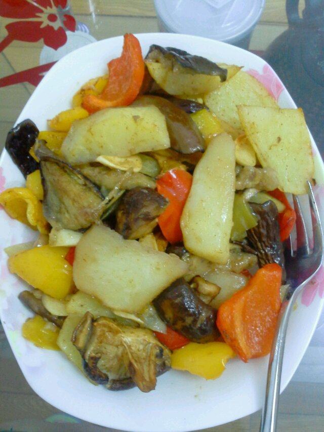 1:将土豆切成滚刀块,香菇,茄子,青红彩椒掰小块,加入盐橄榄油,黑胡椒粉,辣椒粉拌匀