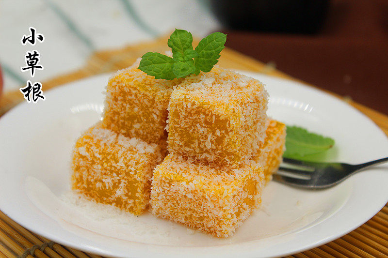 7:南瓜糕从冰箱取出切块,在椰蓉中滚一圈,完成。