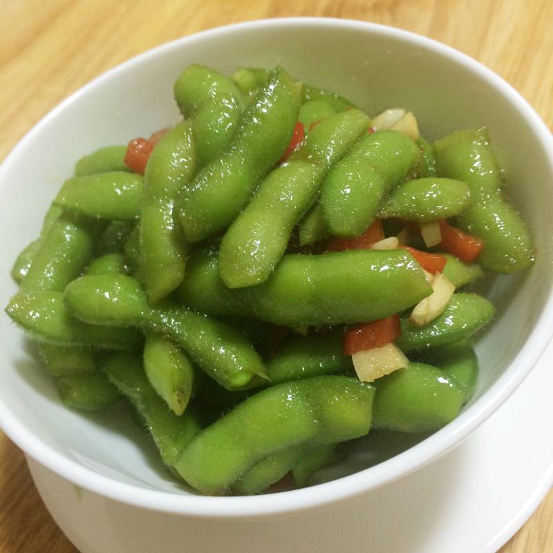 4:煮好的毛豆用漏勺漏起,稍微晾一会,等热气散去,浇上调好的调料。