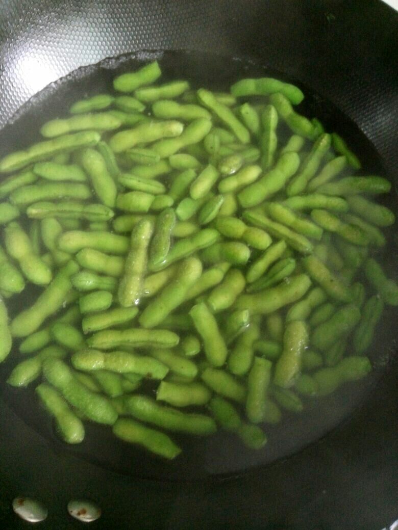 3:一直保持大火水开状态,将毛豆倒入,加两勺盐,几滴油;