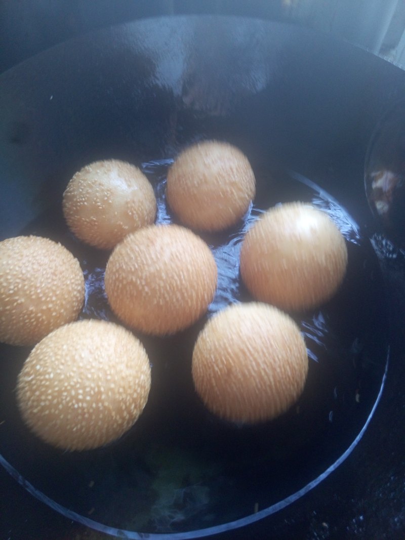 3:分成30个一个的小剂子,沾上白芝麻,油温热到40度就可以放芝麻球了,小火慢慢炸,炸到麻球浮上来,用勺子多次按压,用油往麻球上浇,会慢慢变大,炸到够硬比较不会塌,熟了就可以捞出来