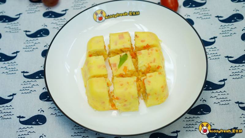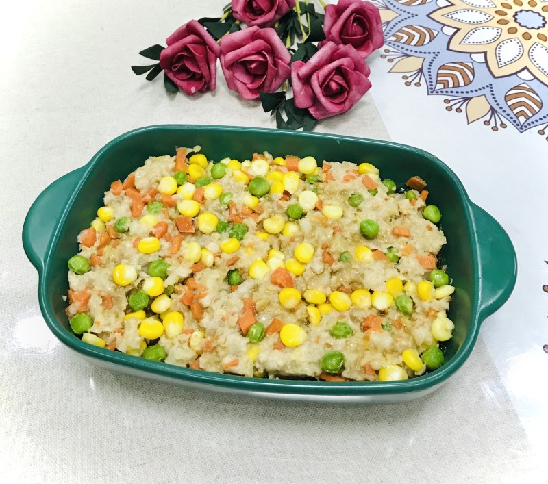 7:放入胡萝卜碎,娃娃菜碎,鳕鱼碎,搅拌均匀。