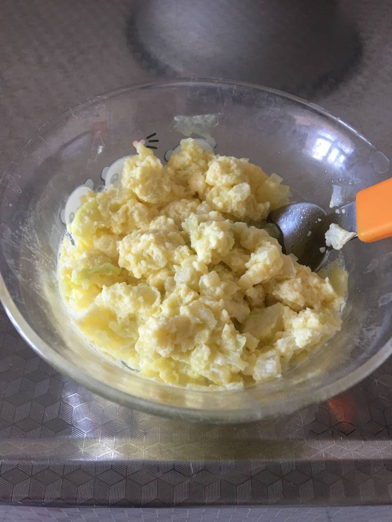 2:白菜叶切碎放入搅拌好的蛋液中,加自来水30ml,拌匀。