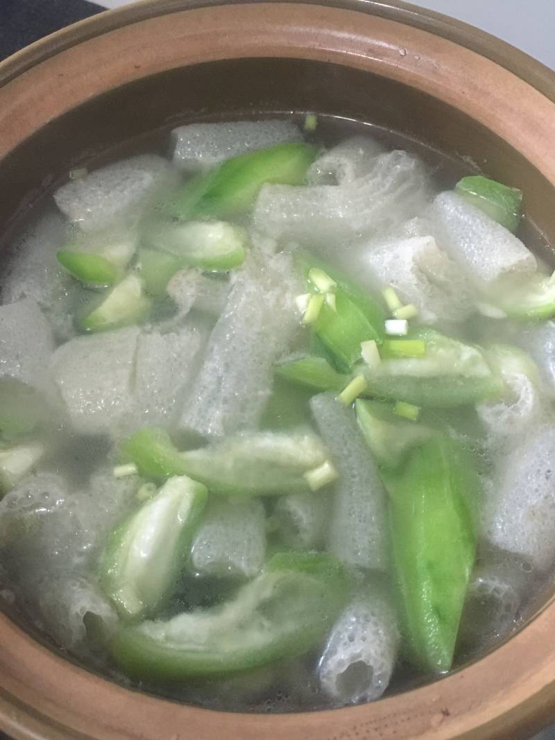 3:竹笙挤干水放入锅中煮15分钟放入瘦肉,丝瓜等待丝瓜熟后就可以起锅了