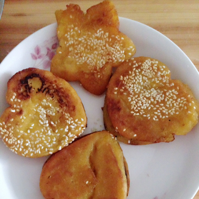 3:差不多后倒入事先打发好的鸡蛋液如果有点还是有点粘就放几勺面粉搅拌均匀随后取出一小团揉搓成饼状在镶嵌几粒黑芝麻下入锅中煎熟即可