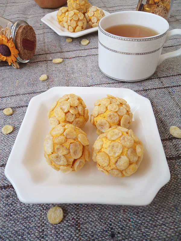 12:再将裹着蛋液的南瓜球放到玉米片上,均匀沾上玉米片。