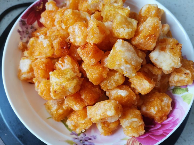 5:锅中加油,烧至七成热时放南瓜进去炸到皮脆捞出。