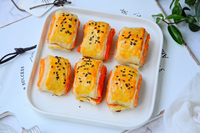 9:烤箱上下温180度预热五分钟,放入红薯卷上下温180度烤25分钟即可。