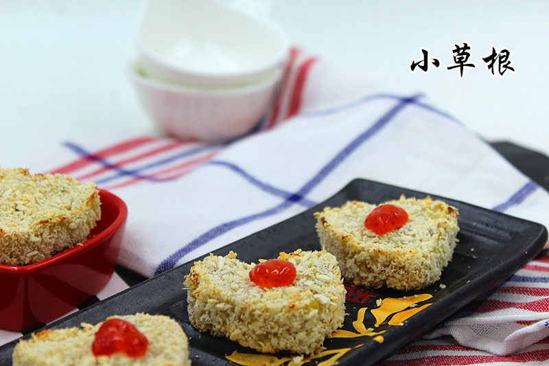 低筋面粉115克;黄油40克;全蛋液40克;玉米淀粉15克;淡奶油130克;椰蓉适量;