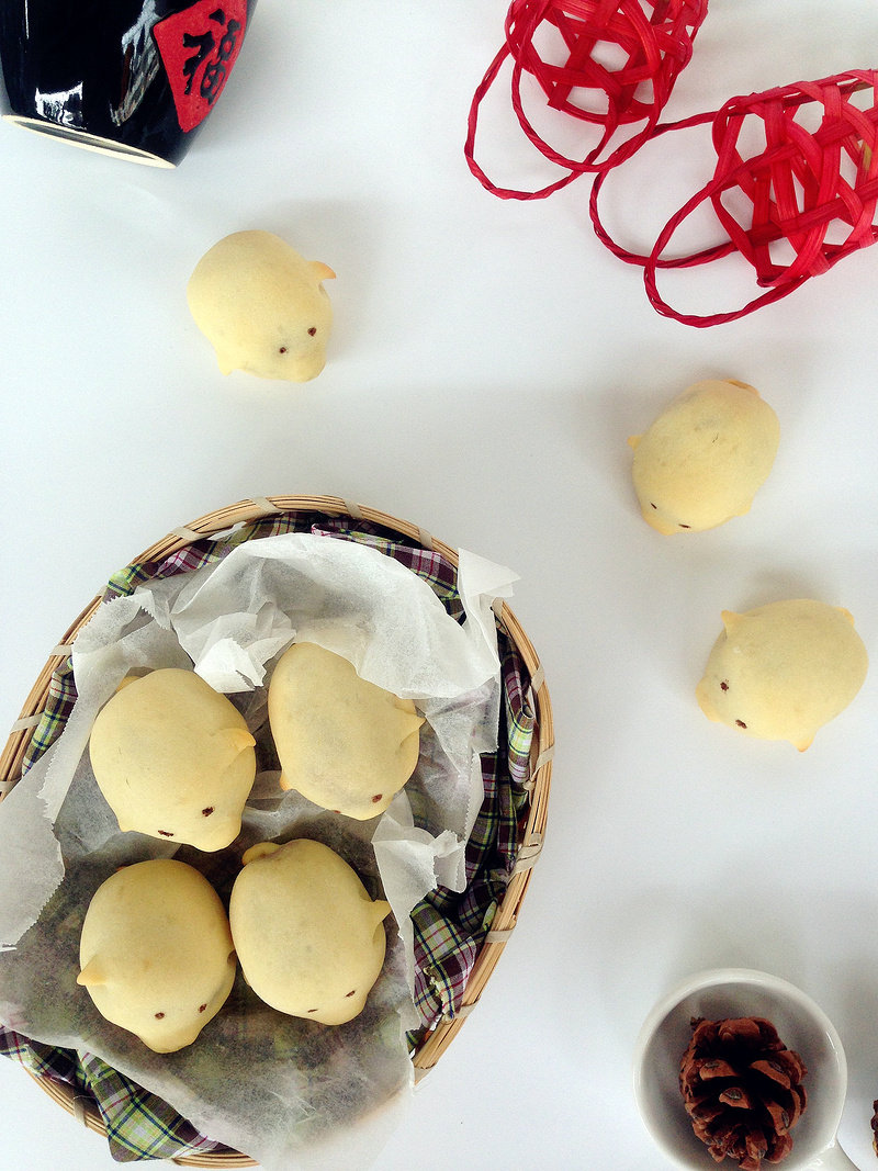 17:最后用黑芝麻装点出小猪的眼睛。(注意黑芝麻在煮的时候容易掉,建议可以用食品笔直接画出小猪眼睛)