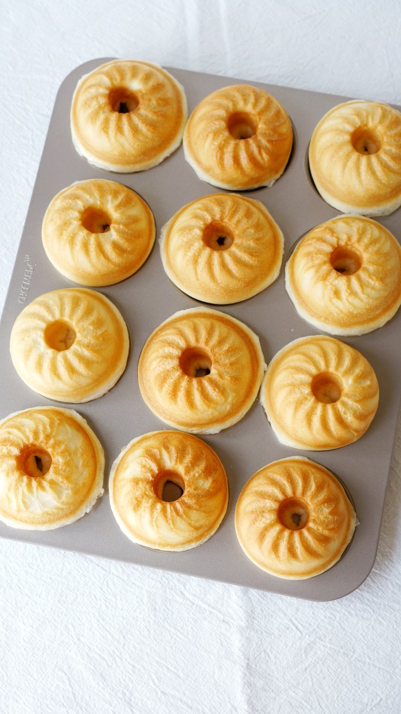 10:发酵好的面团取出,烤箱上下火180度预热,甜甜圈模具上压一个不粘烤盘,放入烤箱中层,上下火180度20分钟,出炉后脱模放凉。