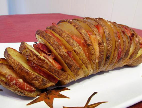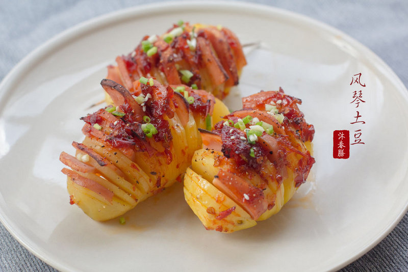 1.土豆切片时,底部两侧垫一双筷子,可以防止切断,切0.3厘米好熟且不易断2.中间的火腿片可以用培根替换,或是自己喜欢的3.土豆第一次烤制为9成熟,锡纸包住是为了均匀受热,不至于里面生外面焦,第二次夹培根烤制时不包锡纸,使土豆片烤略干些好吃4.塞培根是个耐心的技术活,小心点防止弄断土豆片5.大土豆不容易断,小土豆最好下面插一根牙签固定