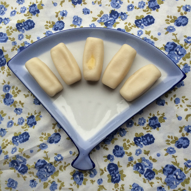 8:把芝心团子,利用双手的大拇指和食指交叉按压成长方形的年糕条。