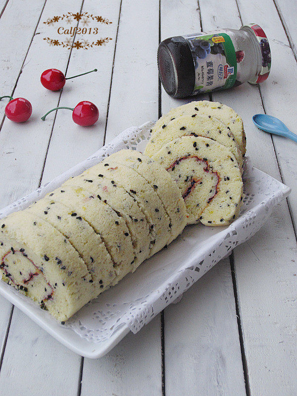16:然后在蛋糕片上抹上一层蓝莓酱。