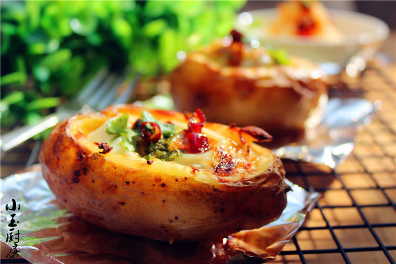 可以加奶酪,但是不能加辣椒了。土豆不能用高压锅压。会压破皮的。烤的时间以自己家的烤箱脾气为准。