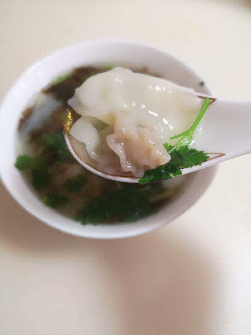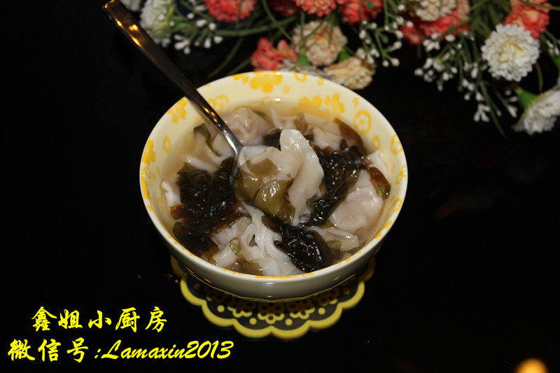 7:水开放入葱花、紫菜、盐、鸡精,熟虾,下入馄饨煮熟,出锅放香油,香菜。