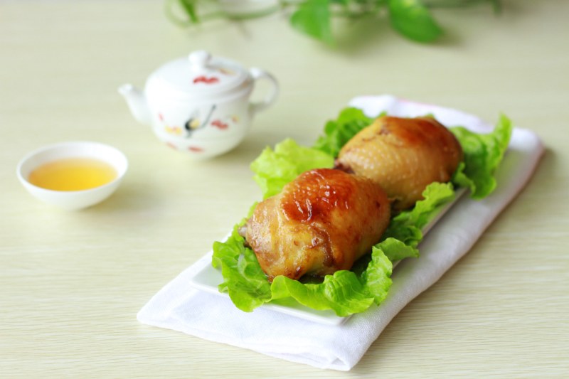 4:取出鸡腿,刷上一层蜂蜜水(蜂蜜和水的比例为1:1),入烤箱继续烤5-10分钟。