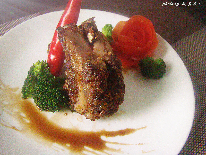 6:羊排烤好之后装盘,西兰花绰水摆盘,可以用番茄皮做些玫瑰花做装饰。淋上黑椒醋汁就可以享用了。