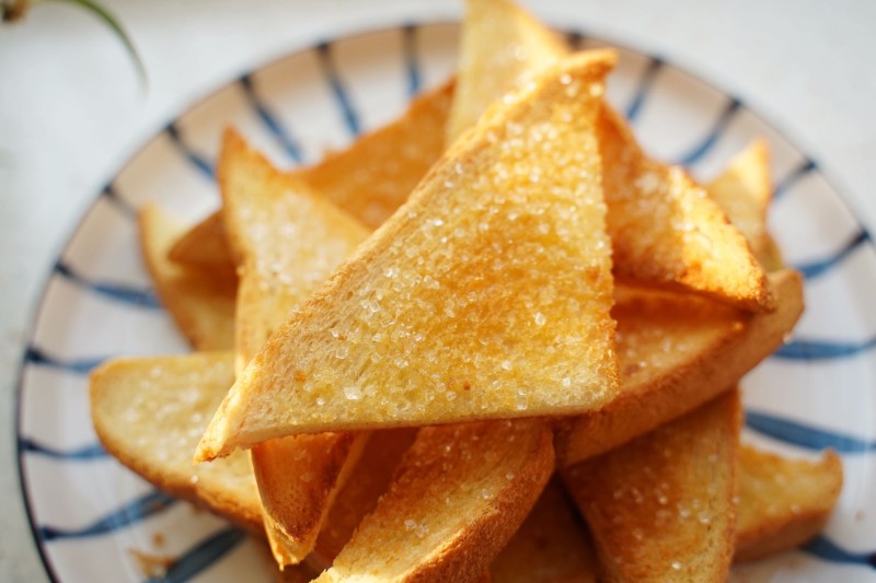 1:预热烤箱150度。取四片吐司,切出中间部分,吐司边不切断。