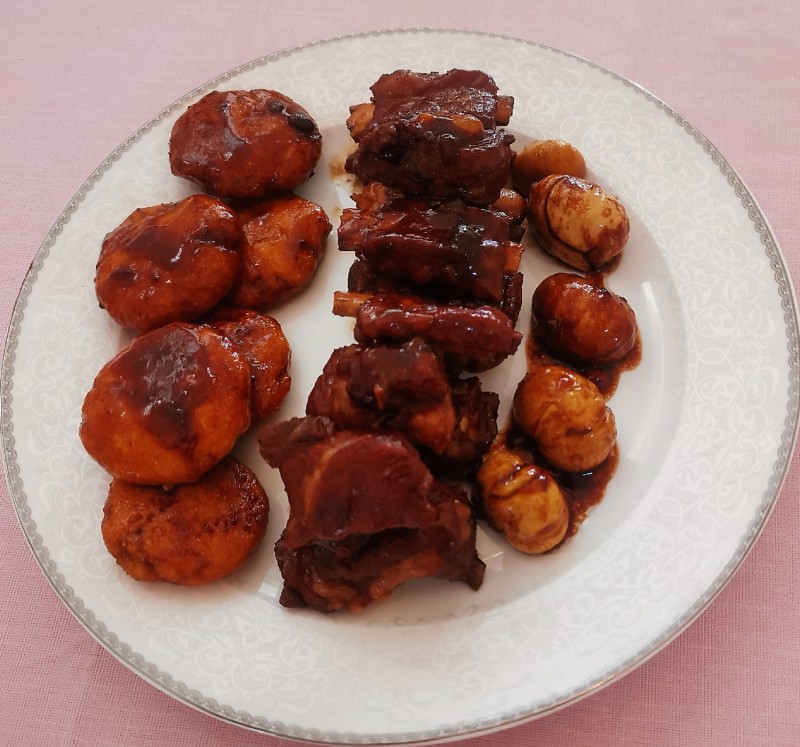 排骨适量;栗子5-6个;玉米面2份;白面1份;牛奶适量;红糖适量;