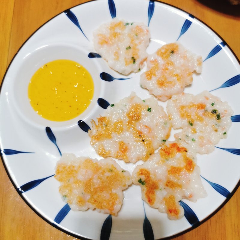 9:锅里刷油,中小火下虾饼,形状可以找好看些的模具,煎至两面金黄就可以了,配个喜欢的酱汁就可以开动了。