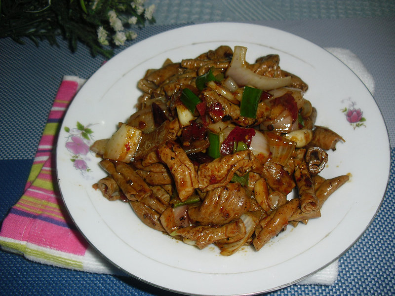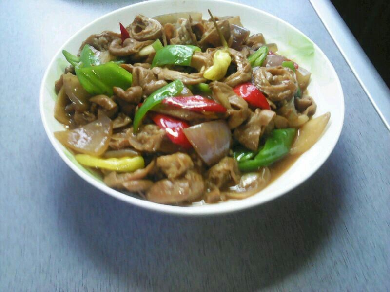3:锅内留底油,爆香葱姜,入大肠,青椒,红椒,洋葱翻炒,加生抽,盐,味精调味。出锅装盘。