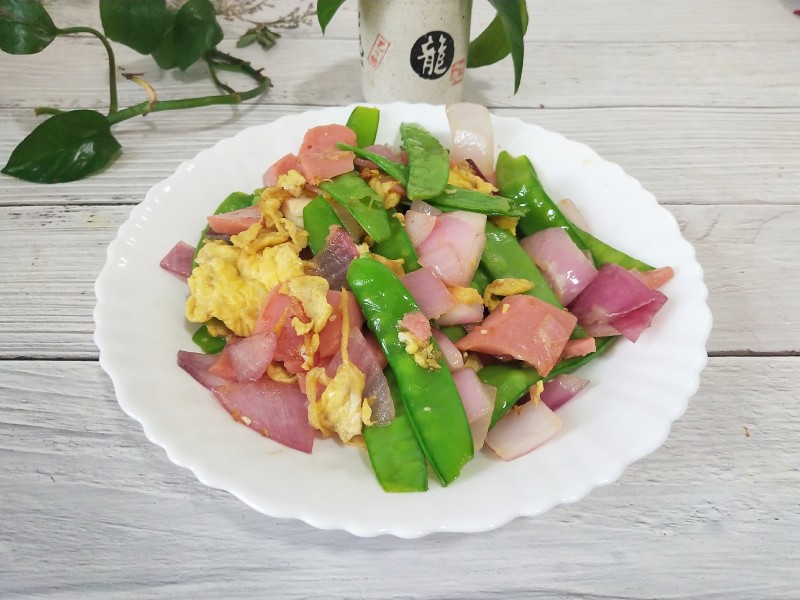 1:备好食材,荷兰豆洗净去筋,香肠、洋葱切片。
