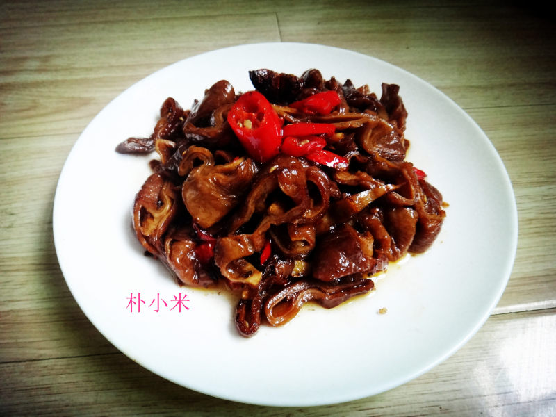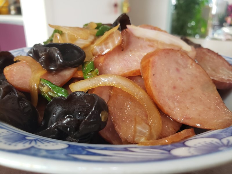 6:锅烧热放少许油,倒入辣椒和洋葱炒香,加盐和生抽调味,翻炒几下,再倒入红肠和木耳翻炒一下即可。