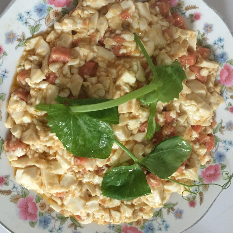 3:豆腐切小块状倒入锅中压碎炒两分钟加入一点点盐鸡粆提鲜盐蛋黄本来就有很重的盐味不要放太多盐加入水淀粉转大火沟欠即可起锅摆盘配绿叶茶即可大人小孩都爱吃软硬交叉口感柔滑