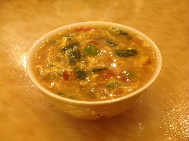 5:锅内倒油,油热把西红柿和小白菜放锅炒,然后放入豆腐,锅内加水烧开,放木耳和剩下的鸡蛋液,倒入疙瘩搅拌