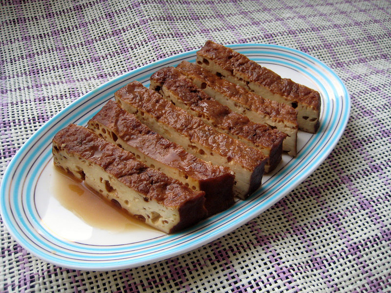 1:豆腐切大块,放电饼铛上两面稍煎,不用放油