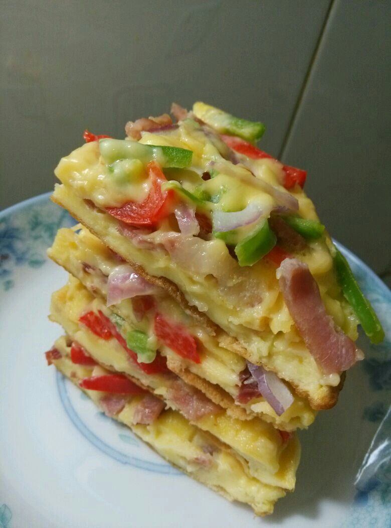 奶酪2片;青椒1个;红椒1个;洋葱1/2个;培根3片;