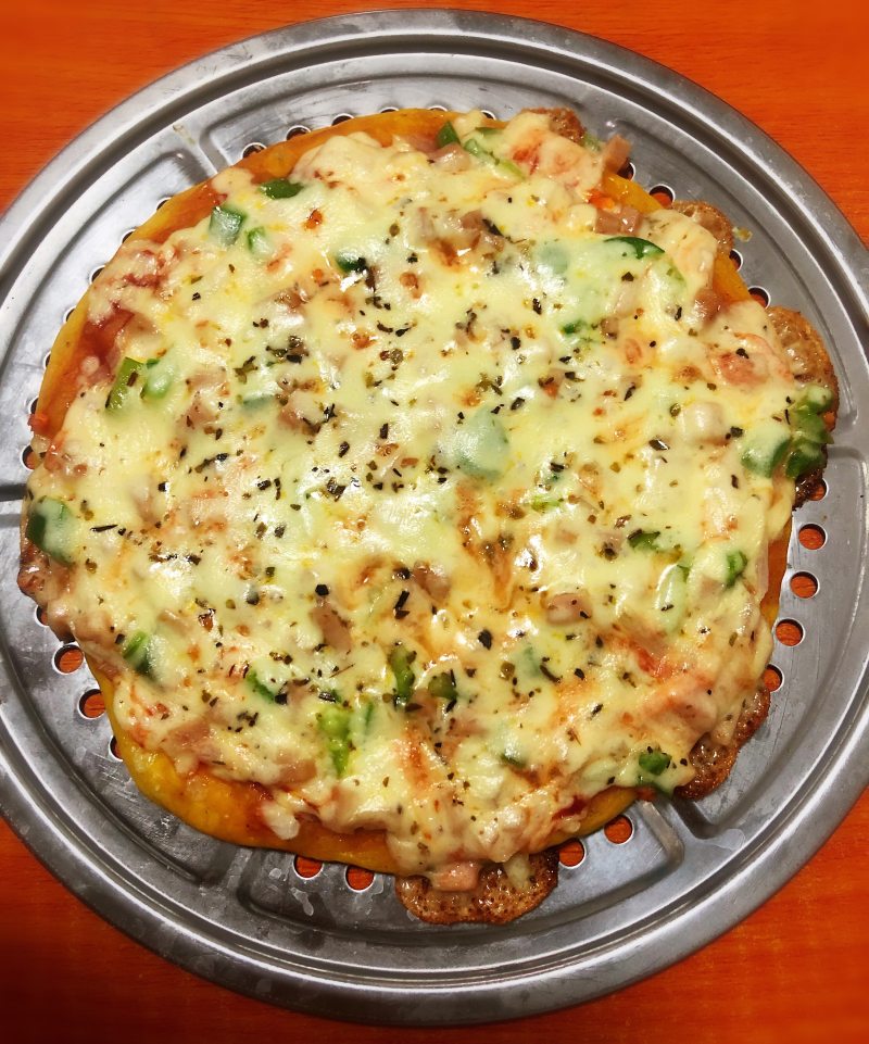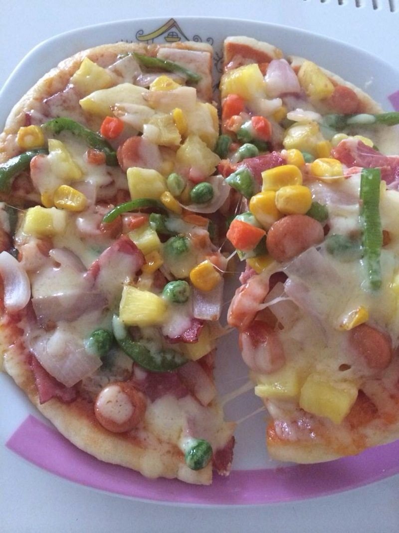 4:面团擀成饼,饼比硬币稍厚。不开火,平底锅上刷油;饼放平底锅里;用餐叉在饼上戳洞;抹一层番茄酱;撒一层马苏里拉芝士,披萨草;铺上各种蔬菜;再铺一层芝士,撒披萨草。披萨草没有可以省略。开小火慢慢烙。听见锅里噼啪噼啪的响了,就是芝士融化留下来了。就熟了。