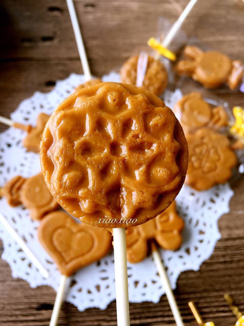 8:取一个小碗倒入凉开水,刮糊刀挑起糖液滴落在凉开水中,这时糖液马上成形尝一下软硬程度。如果不够硬就继续熬到您想要的程度。