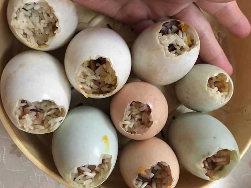 2:糯米泡3小时以上腊肠,香菇切丁后,于糯米一起搅拌放入少量的盐,酱油,鸡精,五香粉也可以放入其他材料,根据个人口味,然后把调好的馅塞入蛋壳里,不要赛满,防止膨胀太厉害朝每个蛋壳里都注入少量的水!清蒸一个小时最好,半小时也行,但是半小时口感不黏糯!不容易成型