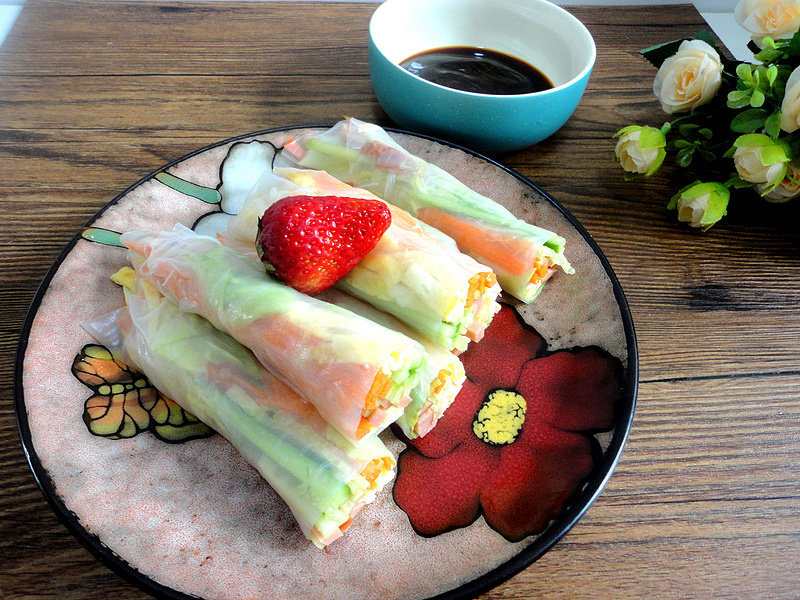 越南春卷皮3张;火腿肠半根;黄瓜1根;海鲜酱2茶勺;白糖1茶勺;