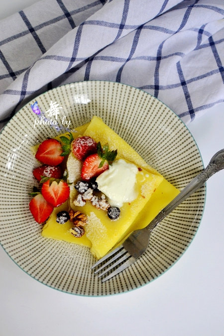 18:这样可丽饼就做好了,可以随意搭配自己喜欢的果酱、搭配水果一起吃。