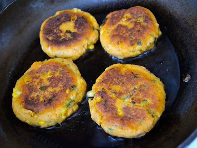 5:在平底锅中倒入植物油烧热,用勺子舀出适量红薯混合物放入锅中,并压成圆饼装,煎至两面金黄即可捞出沥干,配上自制的蘸料食用。
