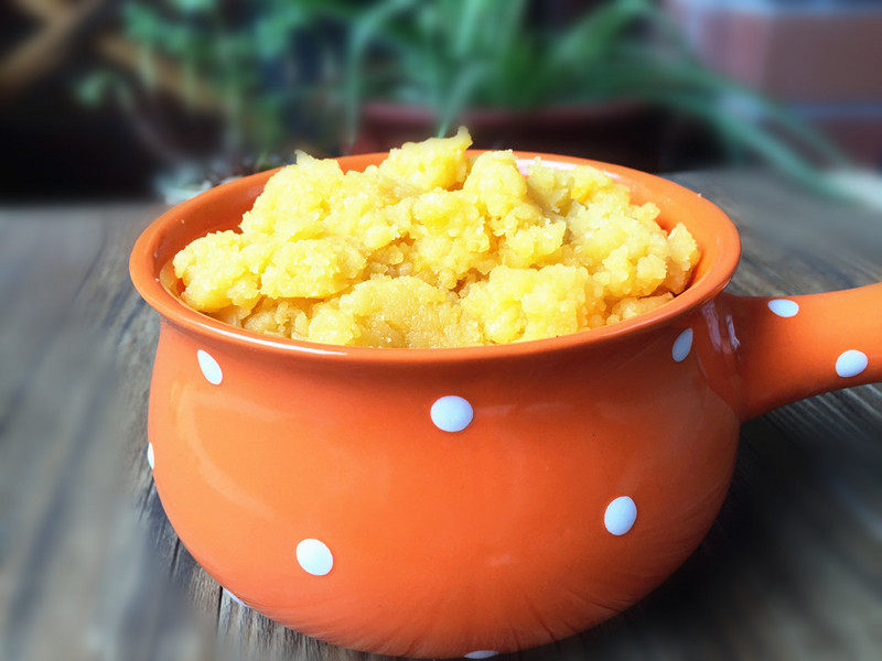 1:咸蛋黄喷少许白酒隔水蒸熟,用勺子压成泥。(也可以装保鲜袋用擀面杖擀压成泥,如果想让馅儿更细腻一些,可以过一下筛,我没有过筛)