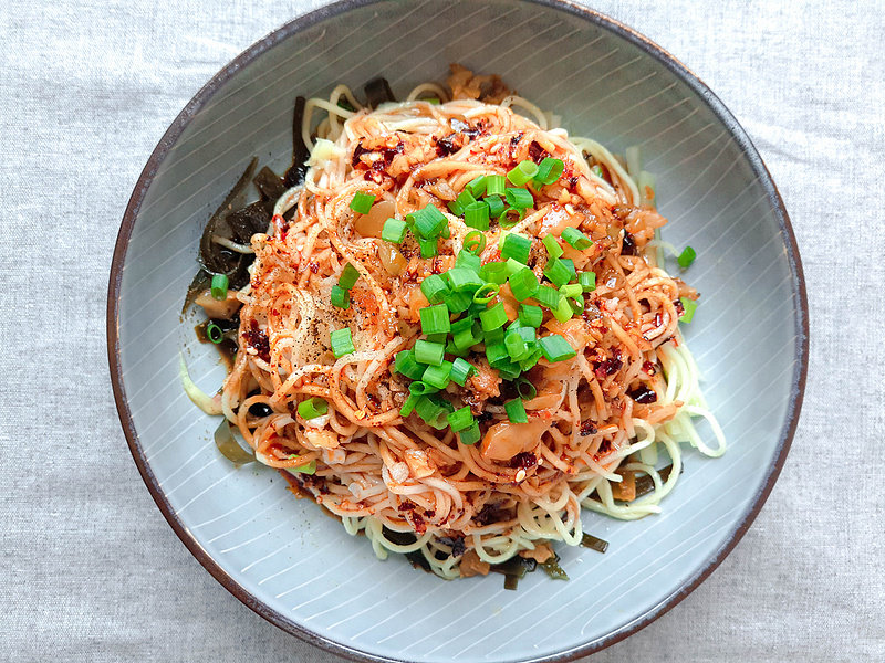 碱面150g;黄瓜30g;海带20g;榨菜5g;姜蒜水5g;葱花5g;