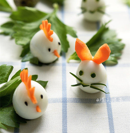 3:3.安上小动物的各部件即可。由于煮熟的蛋本身有湿气,所以胡须、眼睛贴上不会掉。