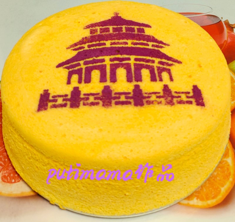 19:金灿灿的南瓜泥大米粉蒸蛋糕新鲜出炉,造型完美,用模具将紫薯粉筛至蛋糕上装饰一下非常漂亮!